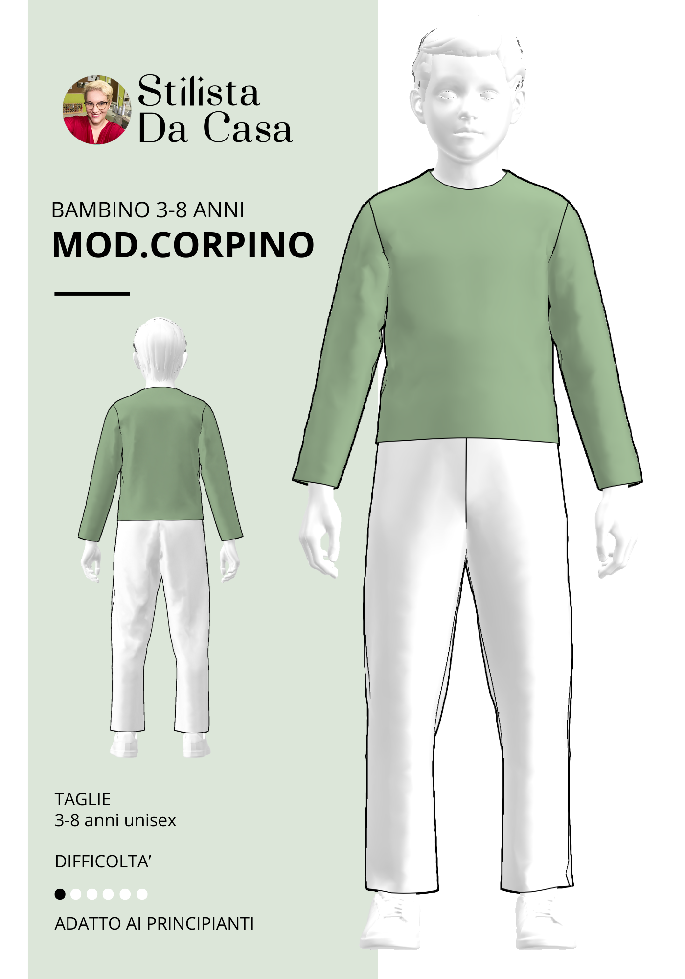 Cartamodello base per realizzare un corpino bambino semplice e versatile, ideale per creare magliette, felpe leggere, vestitini o top. Progettato per taglie da 3 a 8 anni, è un’ottima base su cui costruire modelli personalizzati per ogni stagione.