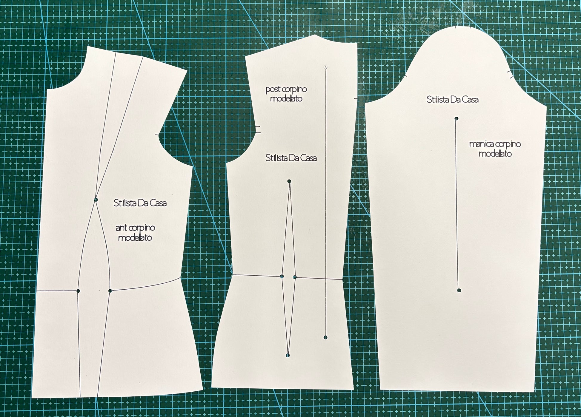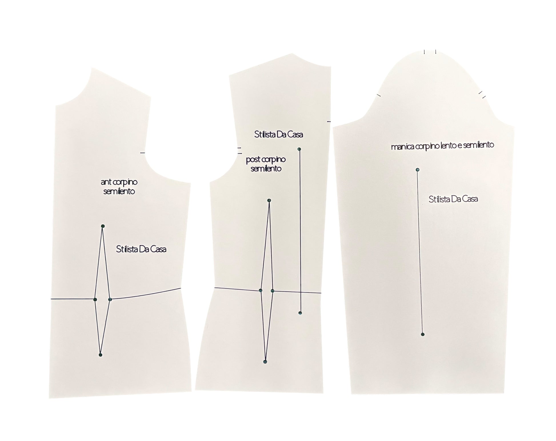 - Base Corpino Lento + Semilento + Manica in Scala 1:2: Progettata per la creazione di corpini con vestibilità più morbida, inclusa la manica, ideale per bluse e abiti leggeri.