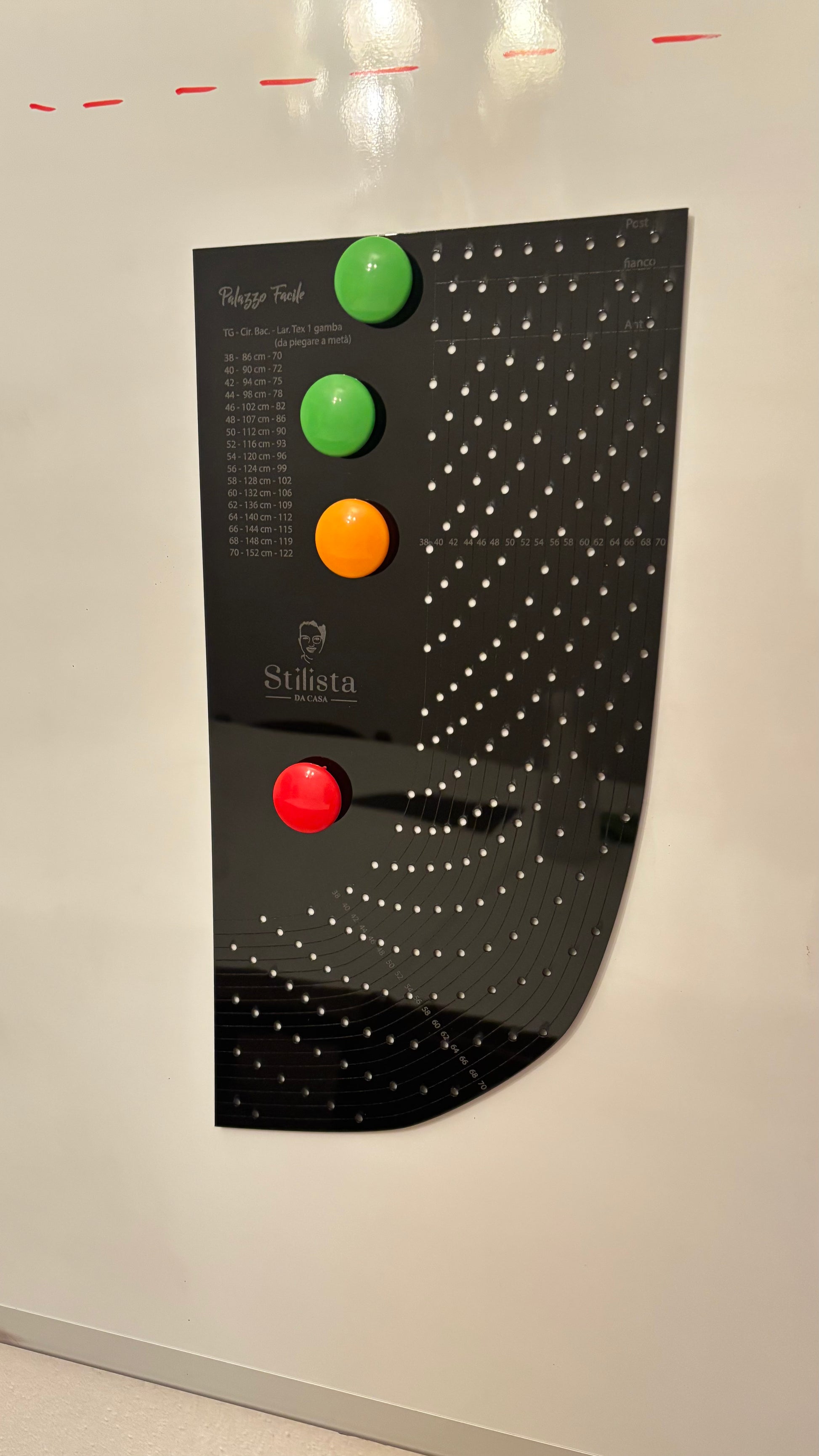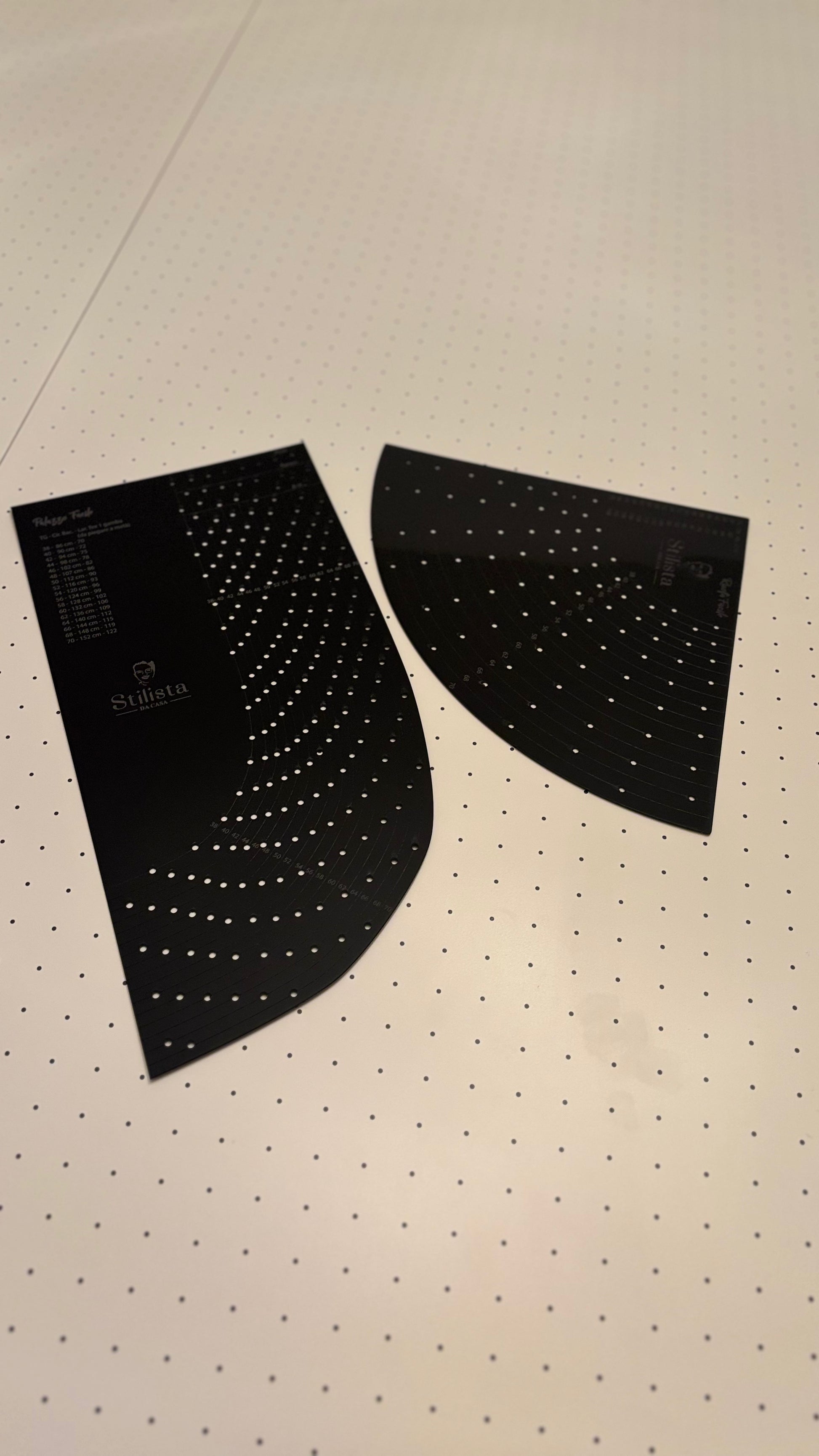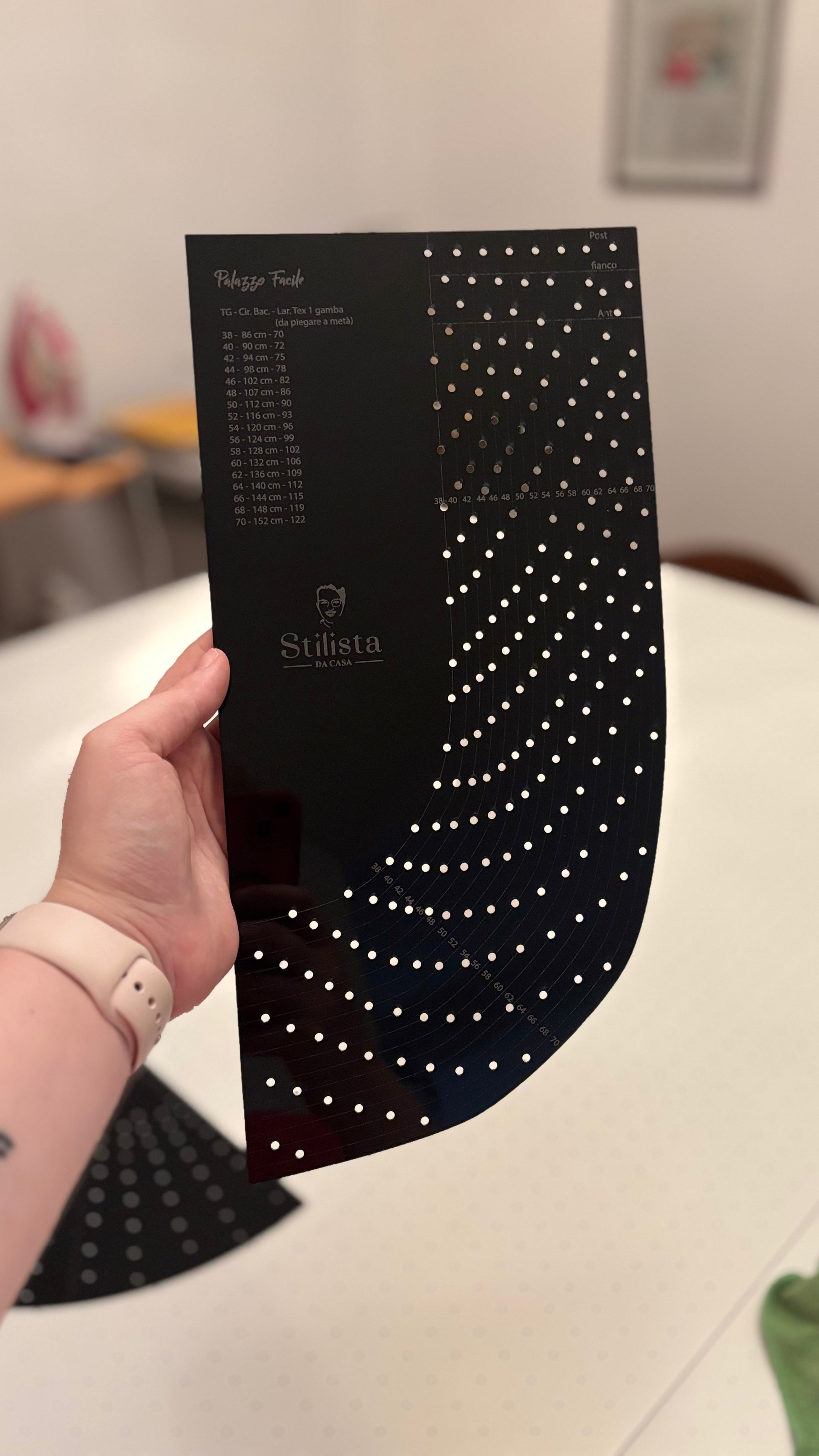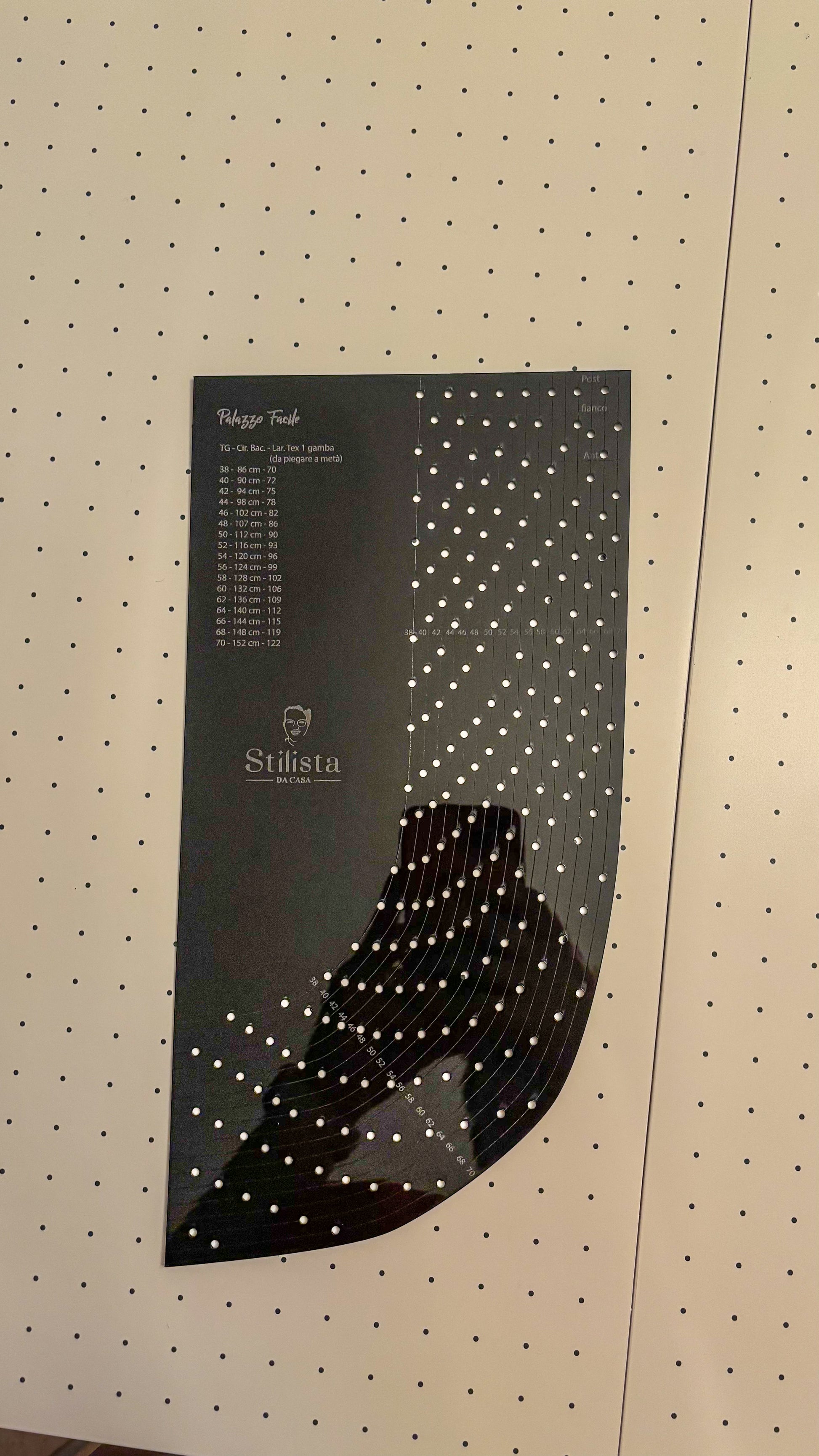 PalazzoFacile è lo strumento che rivoluziona la creazione dei pantaloni a palazzo. Niente più cartamodelli complicati o errori di misura: basta piegare il tessuto, posizionare il righello e seguire la forma. È pensato per rendere il taglio semplice, veloce e preciso!