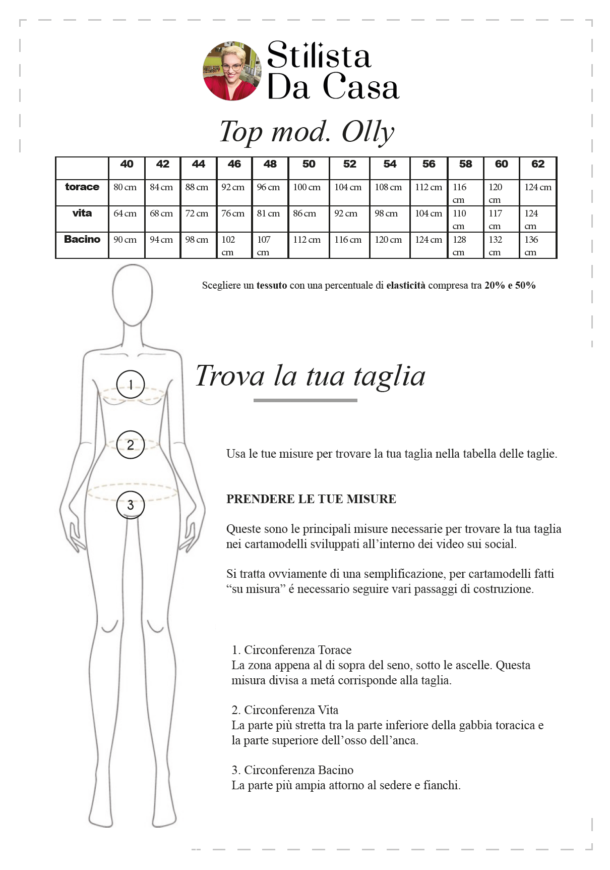 Il cartamodello "Top Mod. Olly" è un'esclusiva progettata per garantirti comfort, stile e una vestibilità impeccabile dalla taglia 40 fino alla taglia 62! Perfetto per realizzare top con scollatura a spalle scoperte e aderenti, ideali sia per look casual che eleganti.